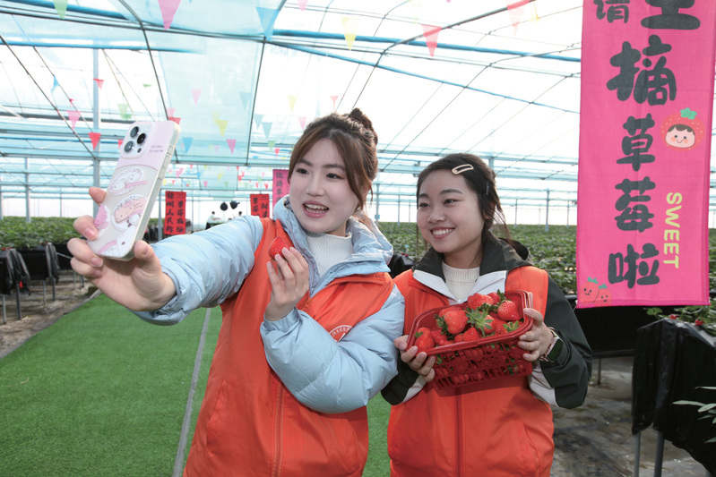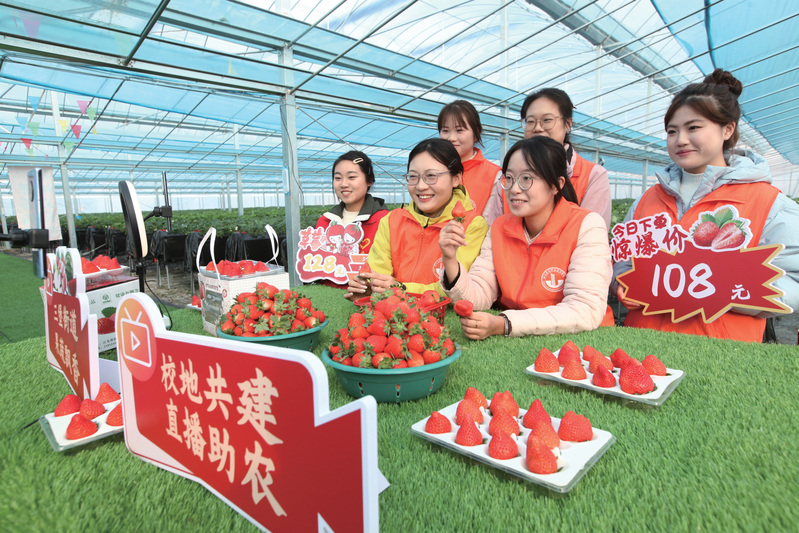 12月17日,江苏米兰·(milan)技术学院经济管理学院电子商务专业的学生在徐州市铜山区三堡街道一农场直播销售草莓。近年来,该校与三堡街道开展校地共建,为大学生搭建社会实践平台,借助电商平台助力地方农产品销售。(蒯创 摄)
